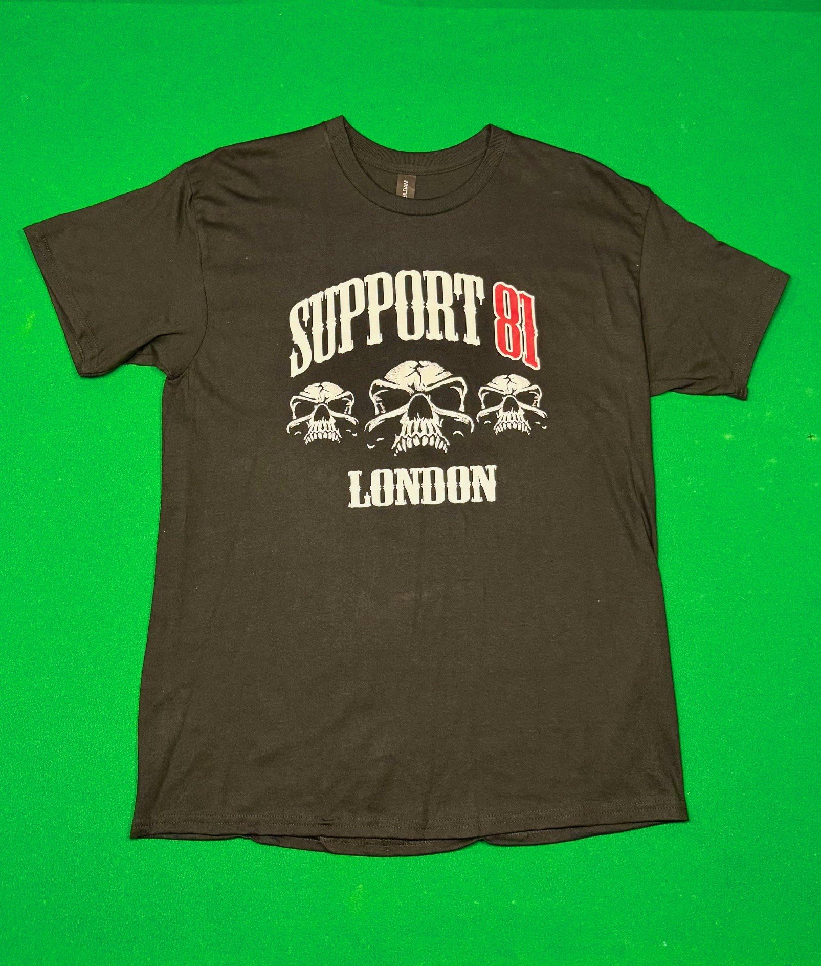 blackT-shirt with large 'Support 81 london and 3 skulls' chest print